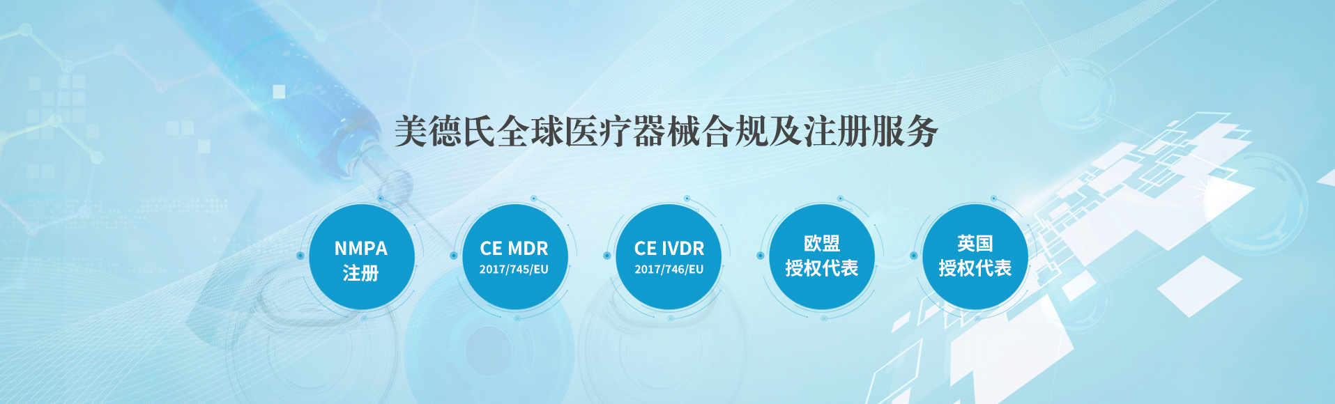 上海美德氏醫(yī)療科技有限公司觸及醫(yī)療行業(yè)熱點(diǎn)需求,提供專業(yè)法規(guī)解讀,專業(yè),誠(chéng)信,可靠,真正為您的醫(yī)療產(chǎn)品出口的合規(guī)環(huán)節(jié)提供全流程解決方案! 美德氏涉及的服務(wù)包括醫(yī)療器械歐盟CE認(rèn)證咨詢(mdr認(rèn)證;IVDR認(rèn)證),ISO 13485咨詢;美國(guó)FDA注冊(cè)(510K;QSR820);歐代美代;國(guó)內(nèi)NMPA注冊(cè)咨詢:醫(yī)療器械歐...